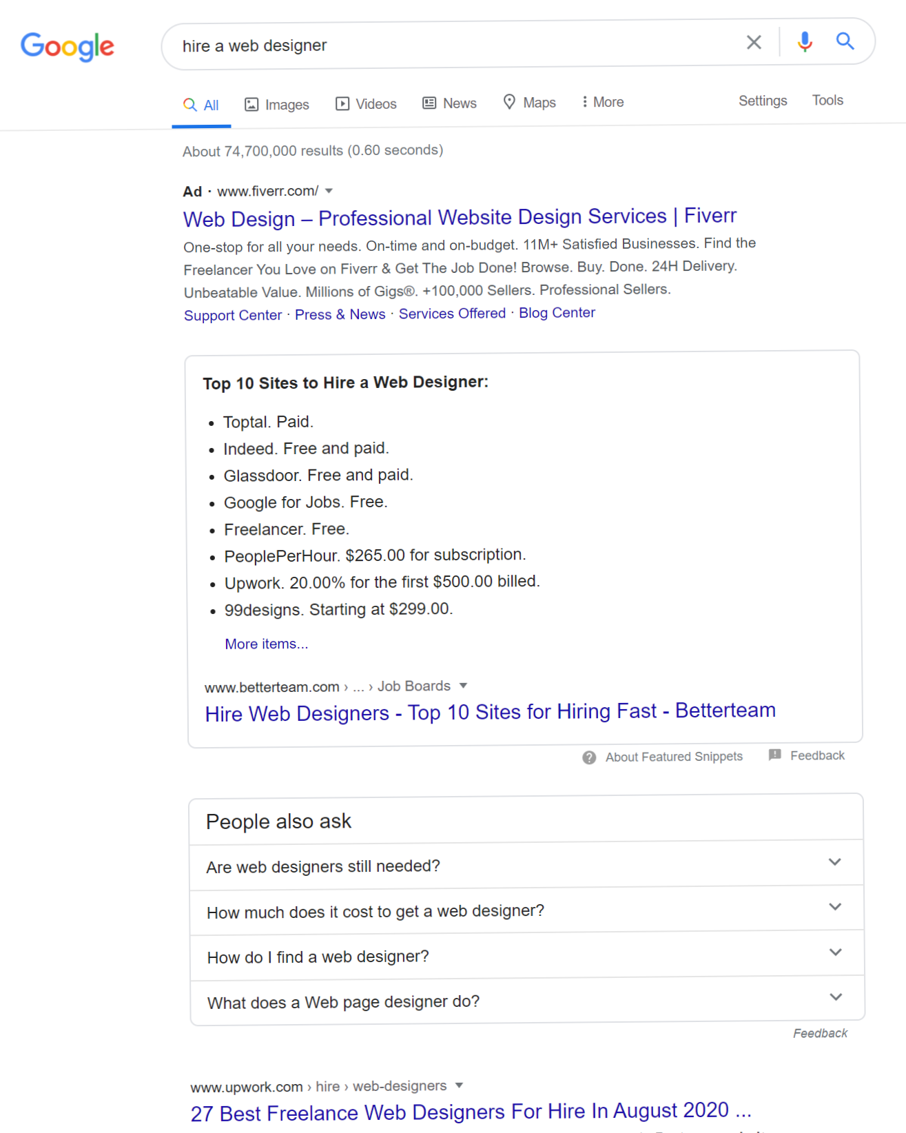 Hey! Have you ever noticed when you search for something online, most of the adverts that you see in the search results look similar? Let’s start by doing a search for “hire a web designer” and having a look through the ads that appear.