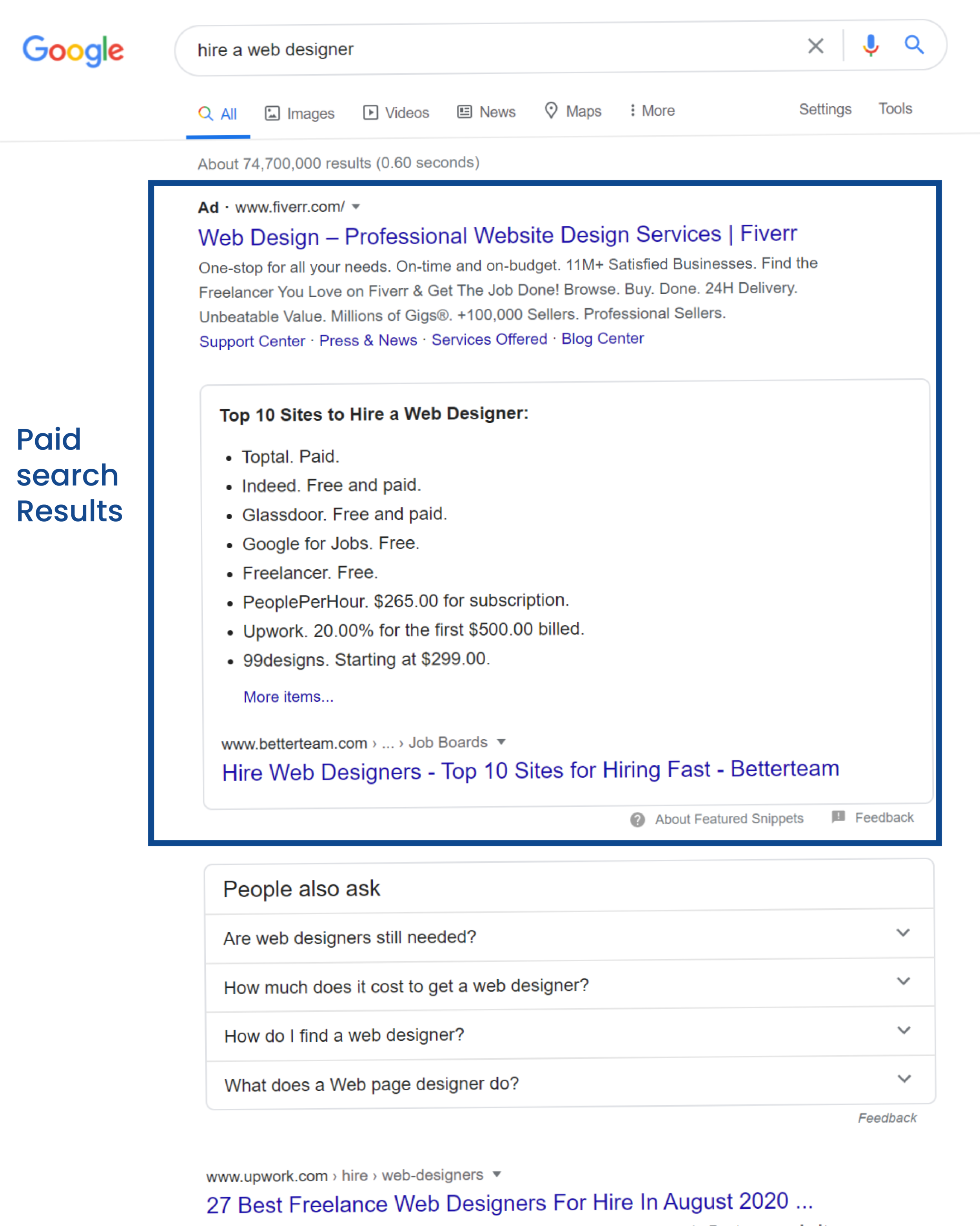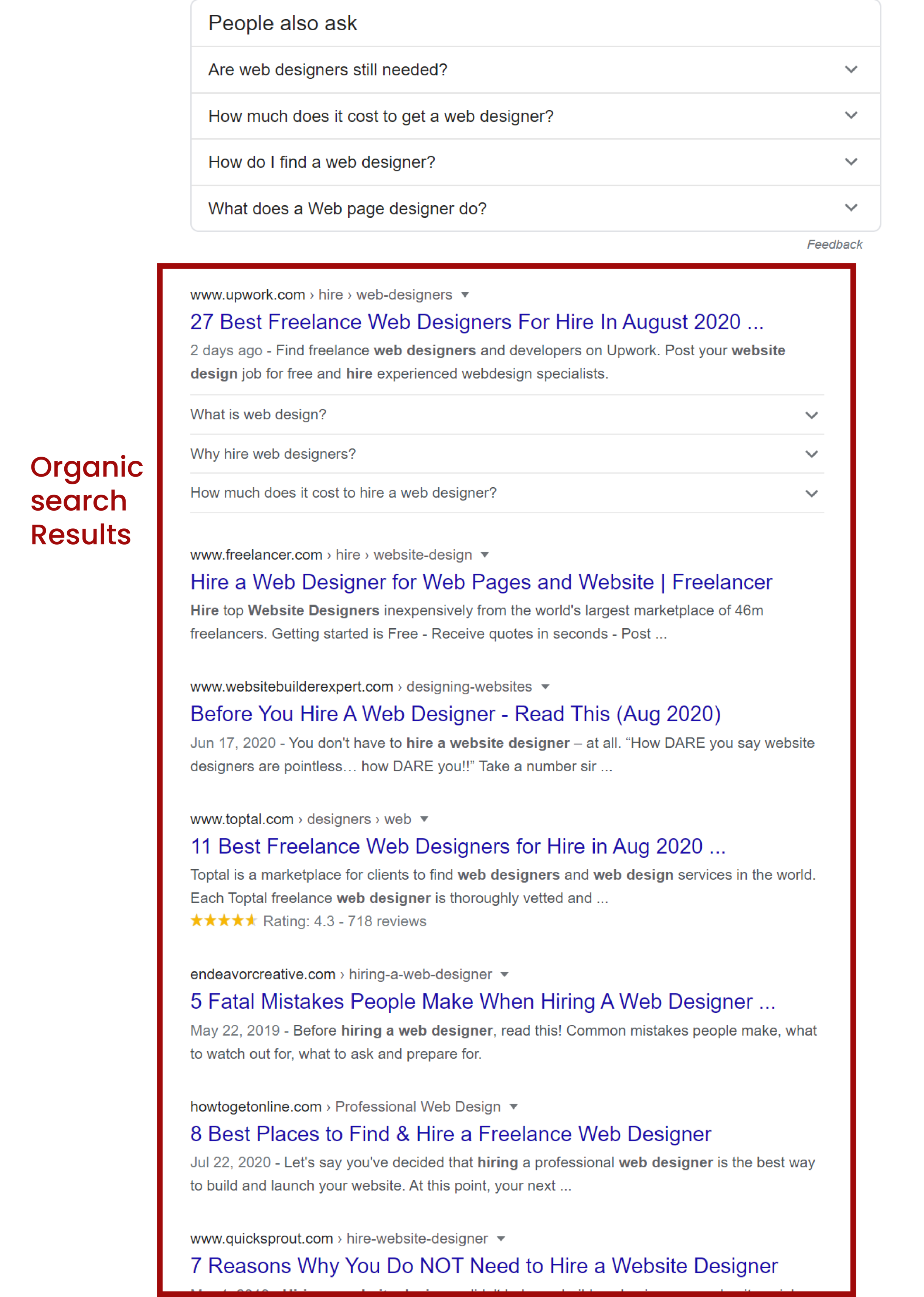 As we are discussing about online advertising, let’s go back to our 1st example “hire a web designer”. As you can see, below, we divided the search results in 2 categories: