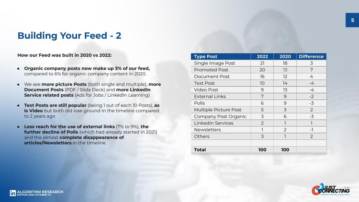 The report by Richard van der Blom shows LinkedIn algorithm changes since September 2022: